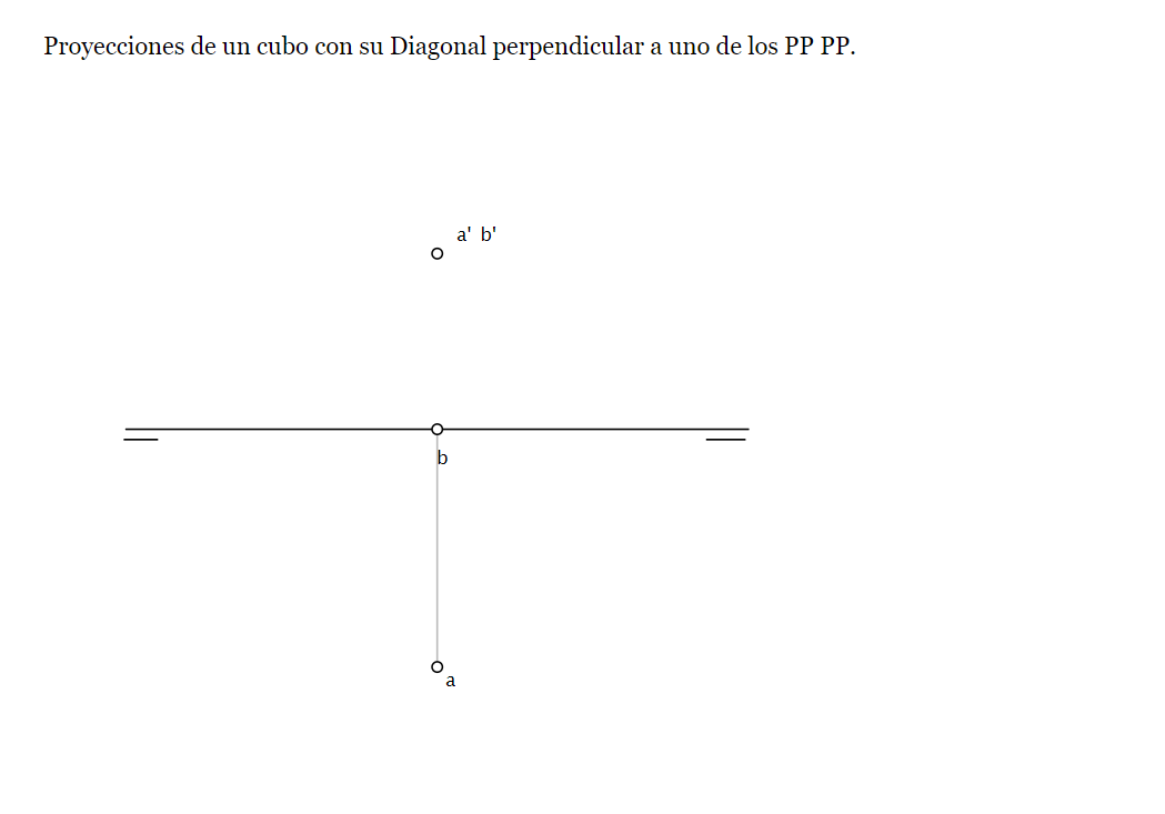 Dado el plano Q paralelo a la línea de tierra y la proyección horizontal -a- del punto A en él contenido, representaremos un hexaedro con una de sus caras apoyada en el plano dado y uno de sus vértices coincidentes con el punto A dado. La magnitud de la arista y la orientación del cubo se dispondrán arbitrariamente.